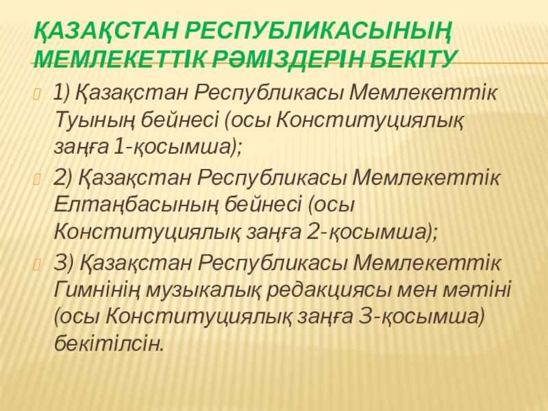 Слайд 10Қазақстан Республикасының мемлекеттiк рәмiздерiн бекiту
