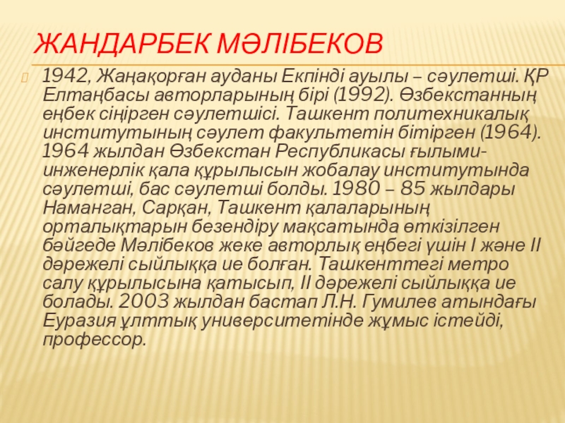 1942, Жаңақорған ауданы Екпінді ауылы – сәулетші. ҚР Елтаңбасы авторларының