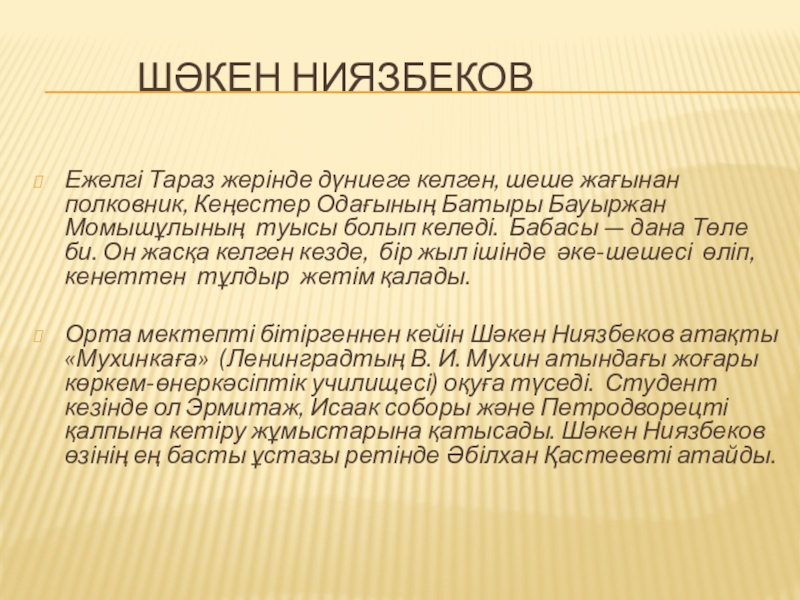 Орта мектепті бітіргеннен кейін Шәкен Ниязбеков атақты «Мухинкаға» (Ленинградтың В. И. Мухин атындағы жоғары көркем-өнеркәсіптік училищесі) оқуға түседі. Студент кезінде ол Эрмитаж, Исаак соборы және Петродворецті қалпына кетіру жұмыстарына қатысады. Шәкен Ниязбеков өзінің ең басты ұстазы ретінде Әбілхан Қастеевті атайды.