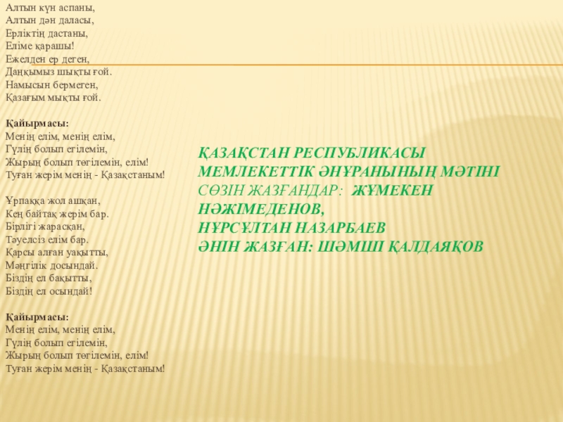 Слайд 12Қазақстан Республикасы Мемлекеттiк Әнұранының мәтiнi
