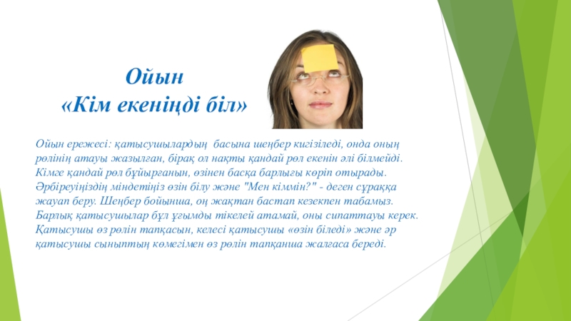 атауы жазылған, бірақ ол нақты қандай рөл екенін әлі білмейді. Кімге қандай рөл бұйырғанын, өзінен басқа барлығы көріп отырады. Әрбіреуіңіздің міндетіңіз өзін білу және "Мен кіммін?" - деген сұраққа жауап беру. Шеңбер бойынша, оң жақтан бастап кезекпен табамыз. Барлық қатысушылар бұл ұғымды тікелей атамай, оны сипаттауы керек. Қатысушы өз рөлін тапқасын, келесі қатысушы «өзін біледі» және әр қатысушы сыныптың көмегімен өз рөлін тапқанша жалғаса береді.