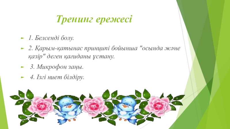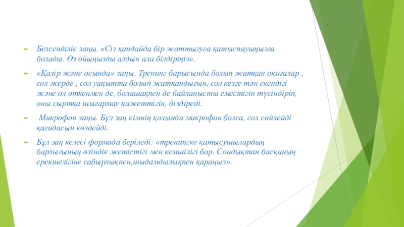 Слайд 3Белсенділік заңы. «Сіз қандайда бір жаттығуға қатыспауыңызға болады. Өз ойыңызды алдын