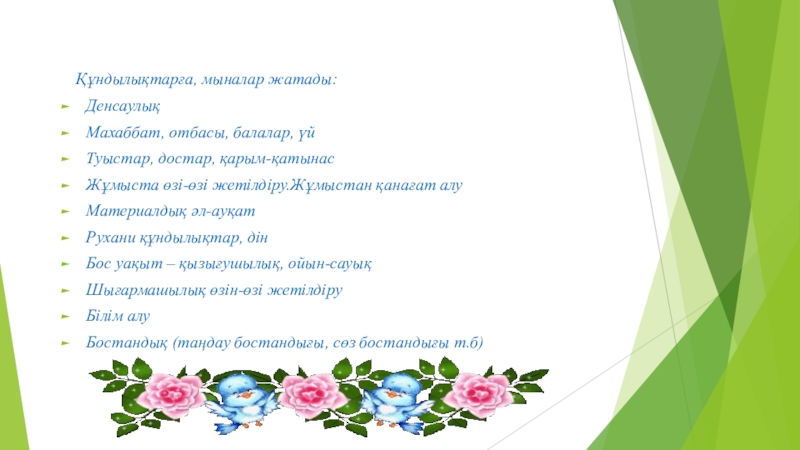 Слайд 9 Құндылықтарға, мыналар жатады: