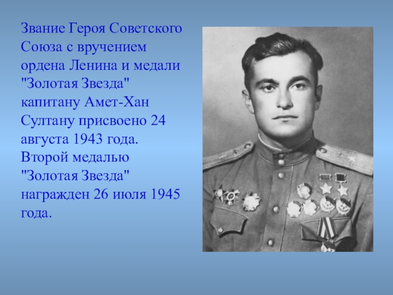 Звезда" капитану Амет-Хан Султану присвоено 24 августа 1943 года. Второй медалью "Золотая Звезда" награжден 26 июля 1945 года.