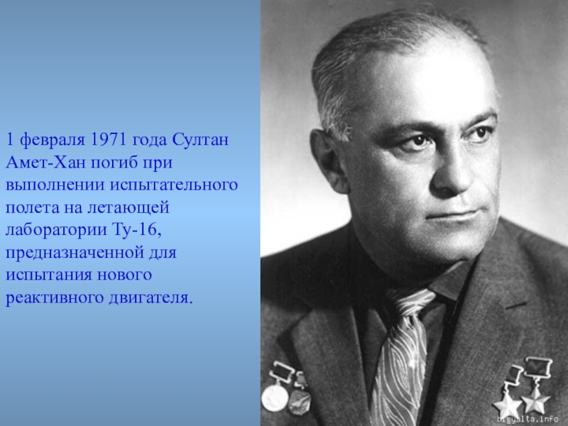 Слайд 91 февраля 1971 года Султан Амет-Хан погиб при выполнении испытательного полета