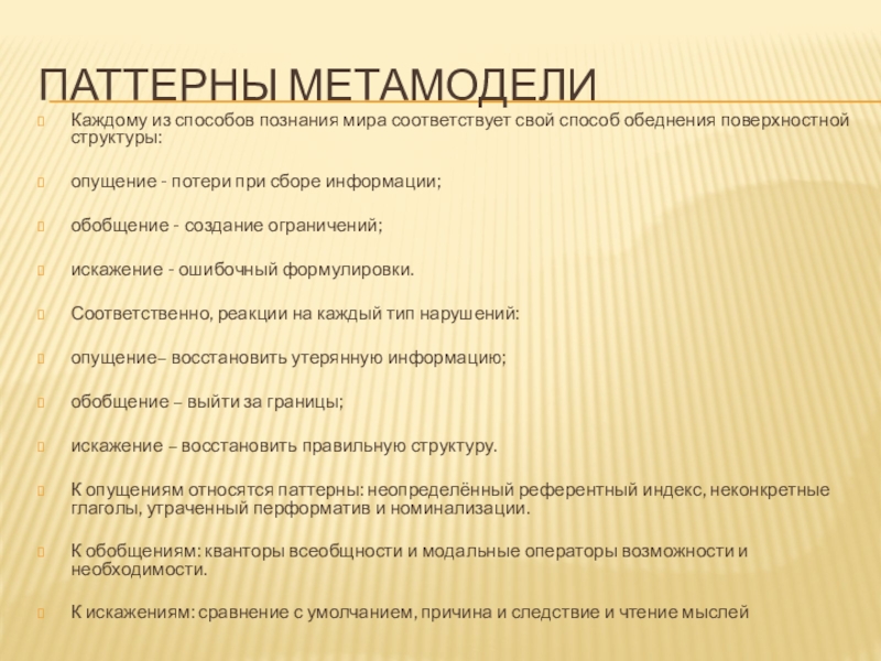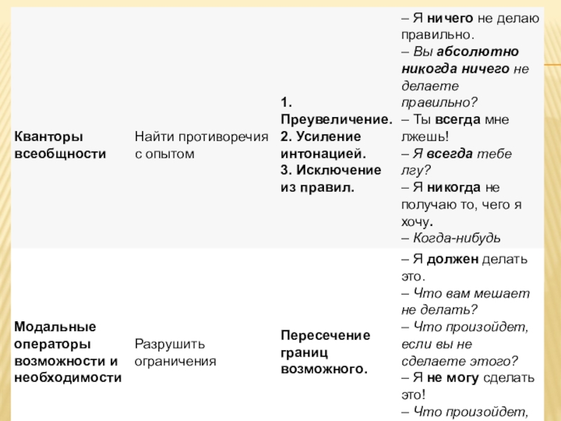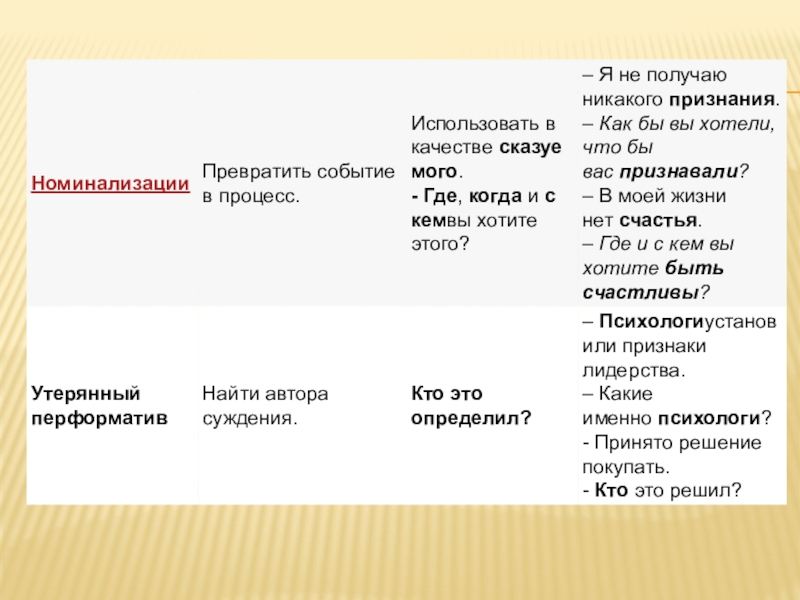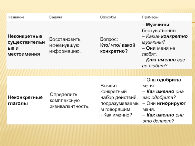 паттерны, которые делают неясным смысл коммуникации, благодаря процессам искажения, упущения и обобщения, и определяет конкретные вопросы, имеющие целью прояснить и поставить под сомнение неточности языка, чтобы восстановить их связь с сенсорным опытом и конкретизировать.