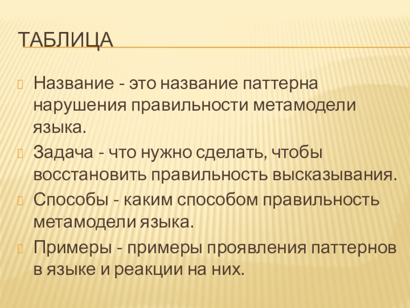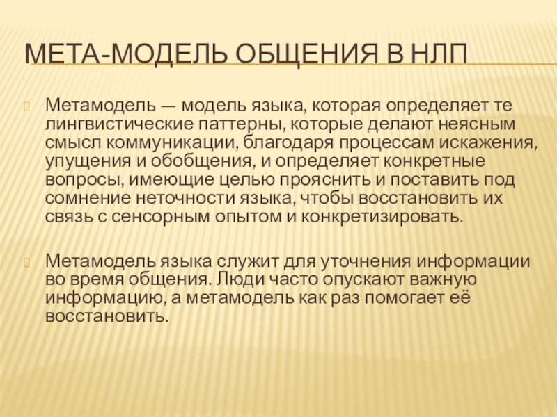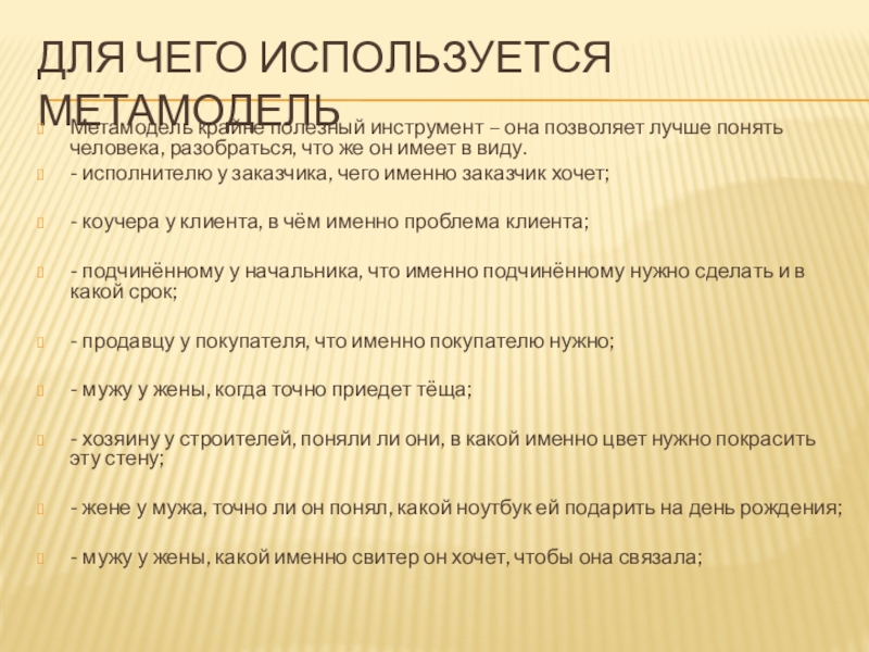 Метамодель языка служит для уточнения информации во время общения. Люди часто опускают важную информацию, а метамодель как раз помогает её восстановить.