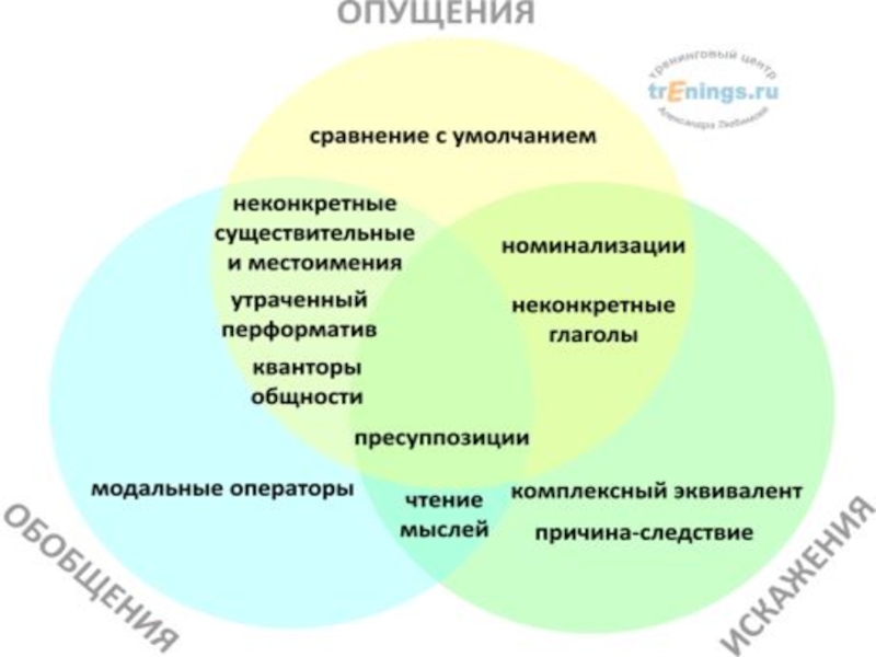 К опущениям относятся паттерны: неопределённый референтный индекс, неконкретные глаголы, утраченный перформатив и номинализации.