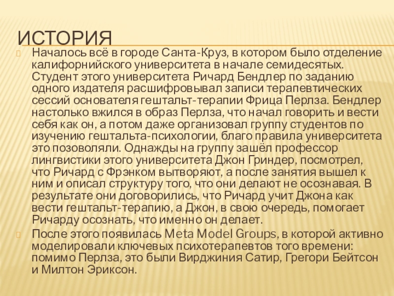в начале семидесятых. Студент этого университета Ричард Бендлер по заданию одного издателя расшифровывал записи терапевтических сессий основателя гештальт-терапии Фрица Перлза. Бендлер настолько вжился в образ Перлза, что начал говорить и вести себя как он, а потом даже организовал группу студентов по изучению гештальта-психологии, благо правила университета это позоволяли. Однажды на группу зашёл профессор лингвистики этого университета Джон Гриндер, посмотрел, что Ричард с Фрэнком вытворяют, а после занятия вышел к ним и описал структуру того, что они делают не осознавая. В результате они договорились, что Ричард учит Джона как вести гештальт-терапию, а Джон, в свою очередь, помогает Ричарду осознать, что именно он делает.
