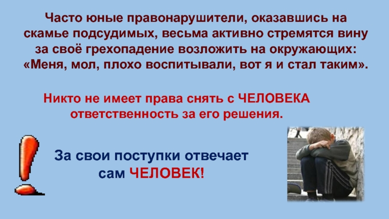 Часто юные правонарушители, оказавшись на скамье подсудимых, весьма активно стремятся вину за своё грехопадение возложить на окружающих: «Меня, мол, плохо воспитывали, вот я и стал таким».