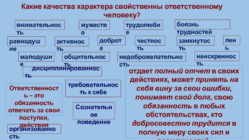 отдает полный отчет в своих действиях, может принять на себя вину за свои ошибки, понимает свой долг, свою обязанность в любых обстоятельствах, кто добросовестно трудится в полную меру своих сил и возможностей.