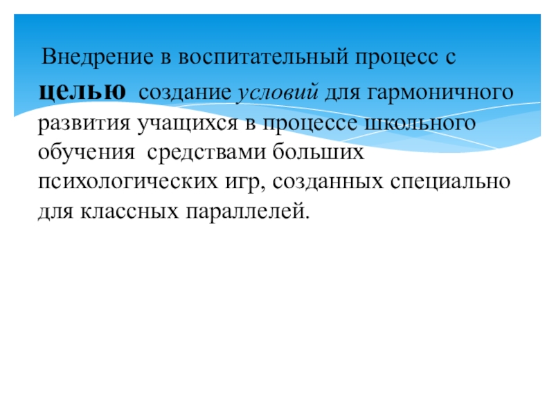 Целью исследования: создание условий для гармоничного развития учащихся в процессе школьного обучения средствами больших психологических игр, созданных специально для классных параллелей.
