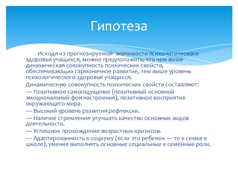 выше динамическая совокупность психических свойств, обеспечивающих гармоничное развитие, тем выше уровень психологического здоровья учащихся.