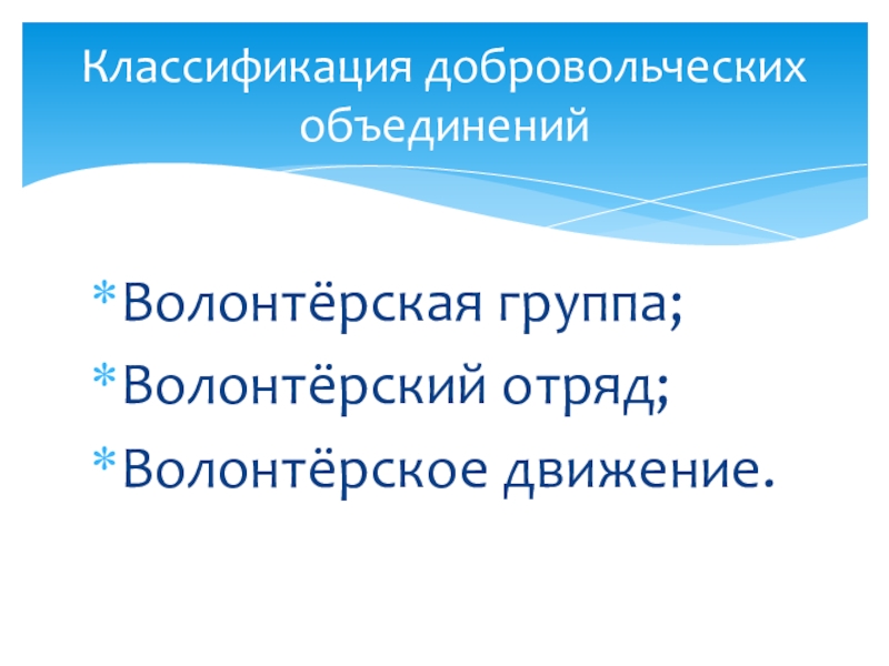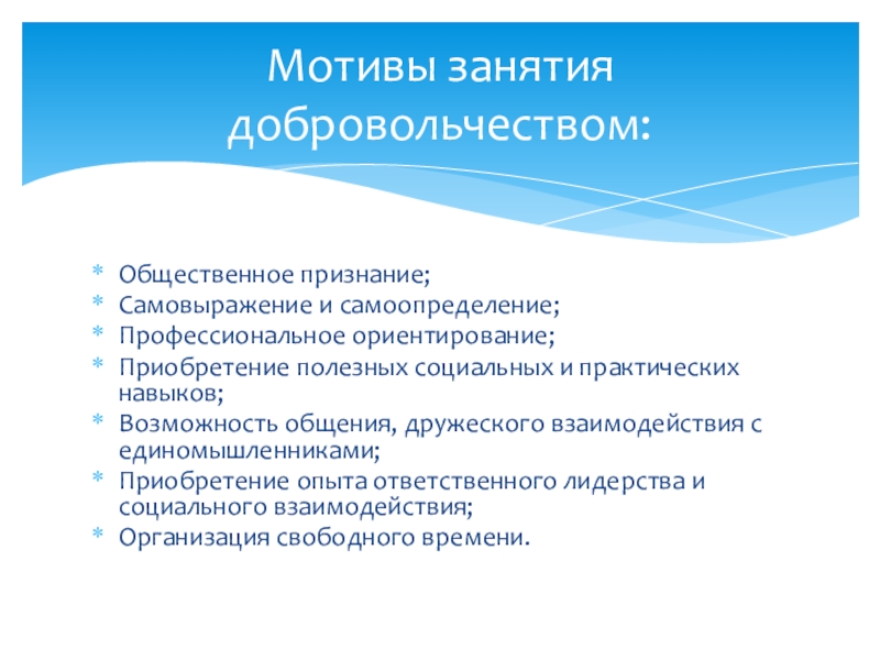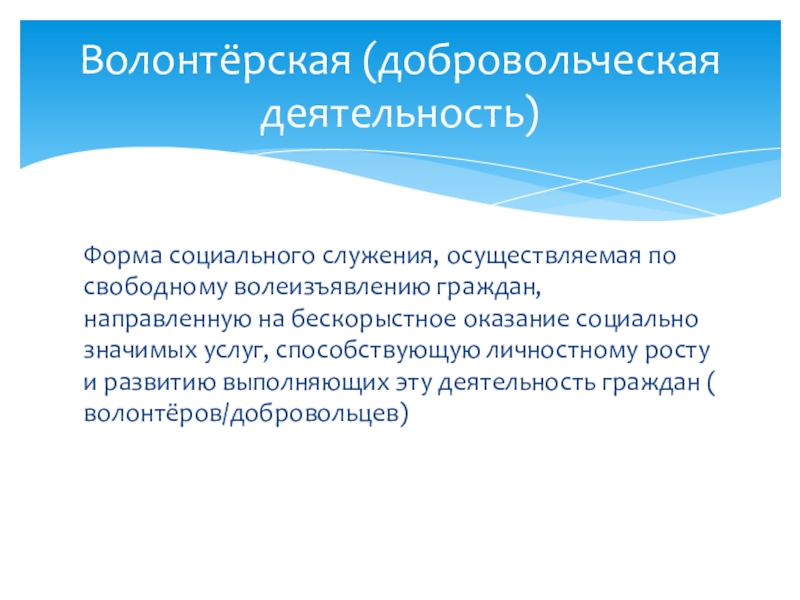 Слайд 31Форма социального служения, осуществляемая по свободному волеизъявлению граждан, направленную на бескорыстное