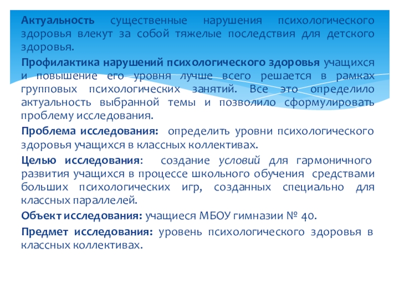 Актуальность существенные нарушения психологического здоровья влекут за собой тяжелые последствия для
