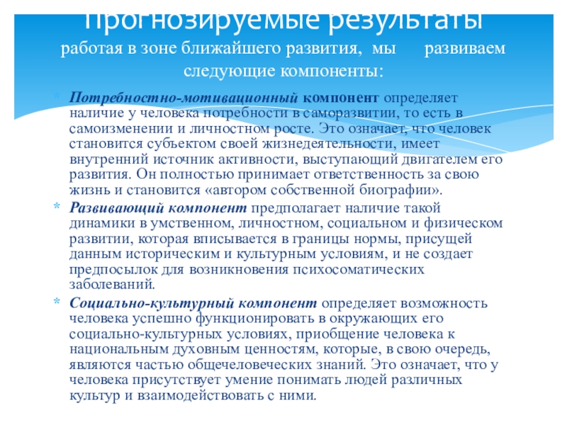 Развивающий компонент предполагает наличие такой динамики в умственном, личностном, социальном и физическом развитии, которая вписывается в границы нормы, присущей данным историческим и культурным условиям, и не создает предпосылок для возникновения психосоматических заболеваний.
