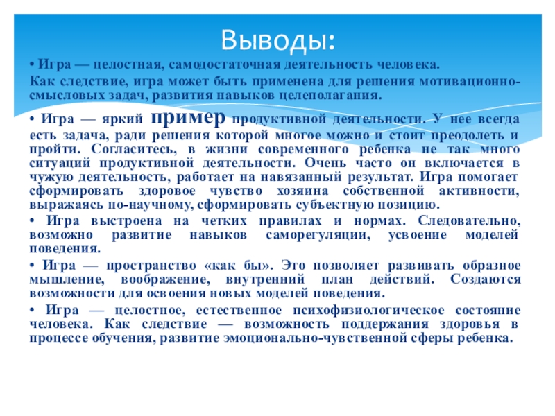 • Игра — целостное, естественное психофизиологическое состояние человека. Как следствие — возможность поддержания здоровья в процессе обучения, развитие эмоционально-чувственной сферы ребенка.