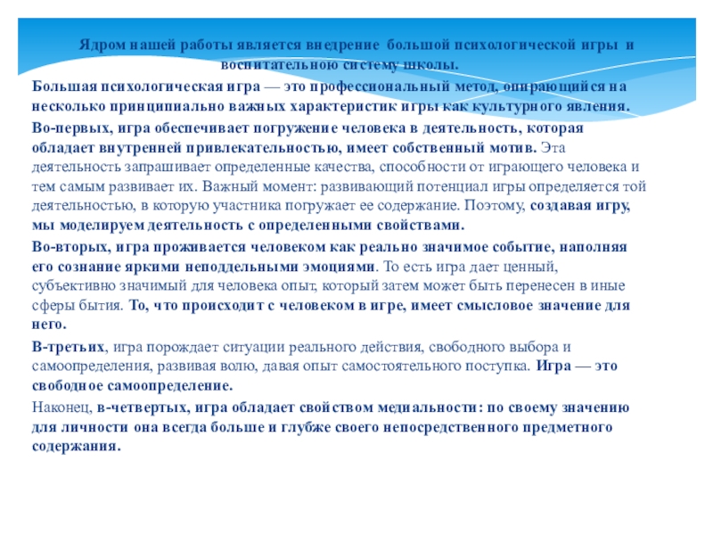 Слайд 23 Ядром нашей работы является внедрение большой психологической игры и воспитательною систему