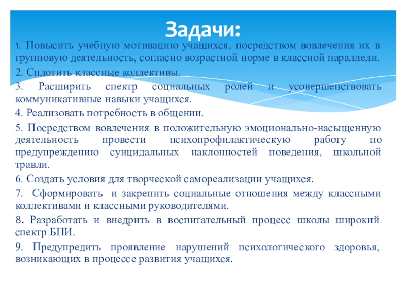 8. Разработать и внедрить в воспитательный процесс школы широкий спектр БПИ.