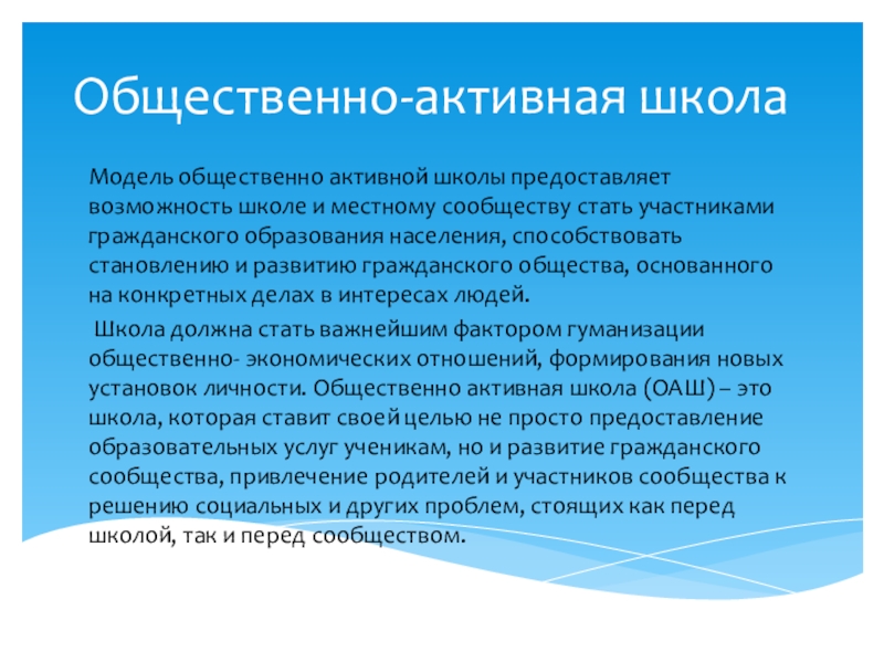 Школа должна стать важнейшим фактором гуманизации общественно- экономических отношений, формирования новых установок личности. Общественно активная школа (ОАШ) – это школа, которая ставит своей целью не просто предоставление образовательных услуг ученикам, но и развитие гражданского сообщества, привлечение родителей и участников сообщества к решению социальных и других проблем, стоящих как перед школой, так и перед сообществом.