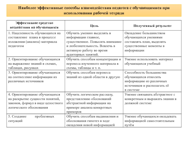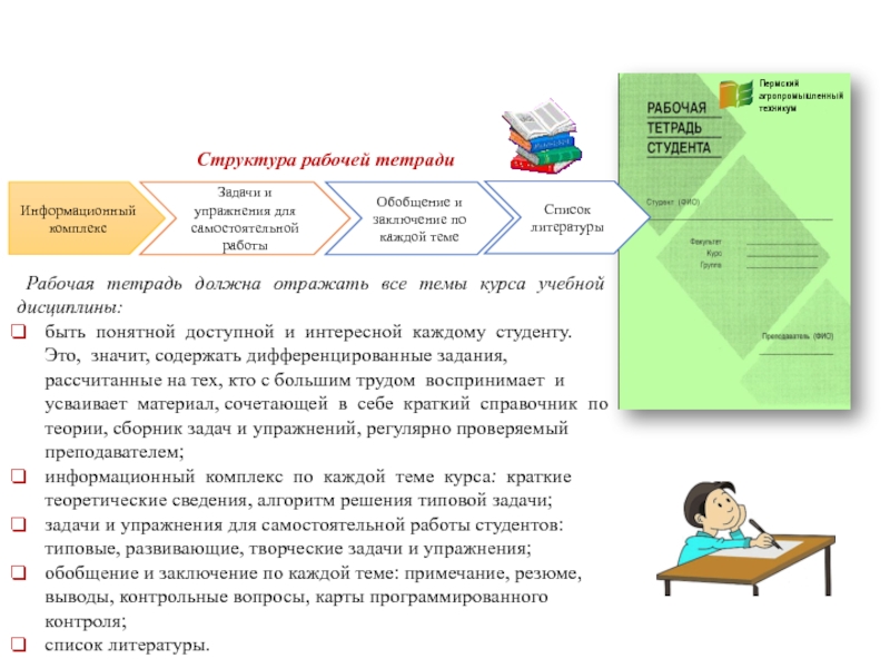 6. Завершает тетрадь заключение, ориентирующее студентов на содержание. Таким образом, современная рабочая тетрадь - это дидактический комплекс, способствующий поэтапному формированию мыслительной деятельности студента и предназначенный для самостоятельной работы в аудитории, лаборатории или дома непосредственно на её страницах.