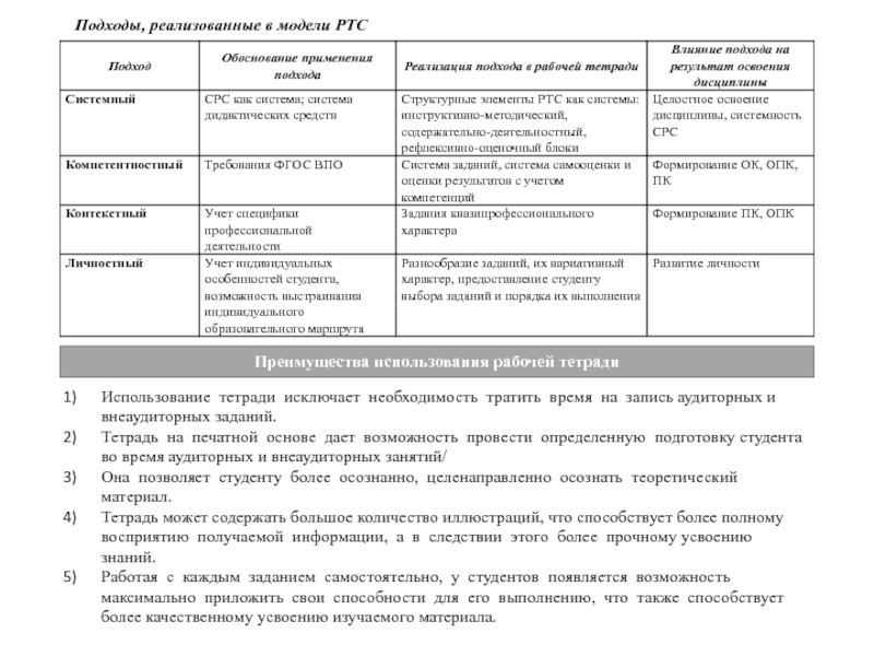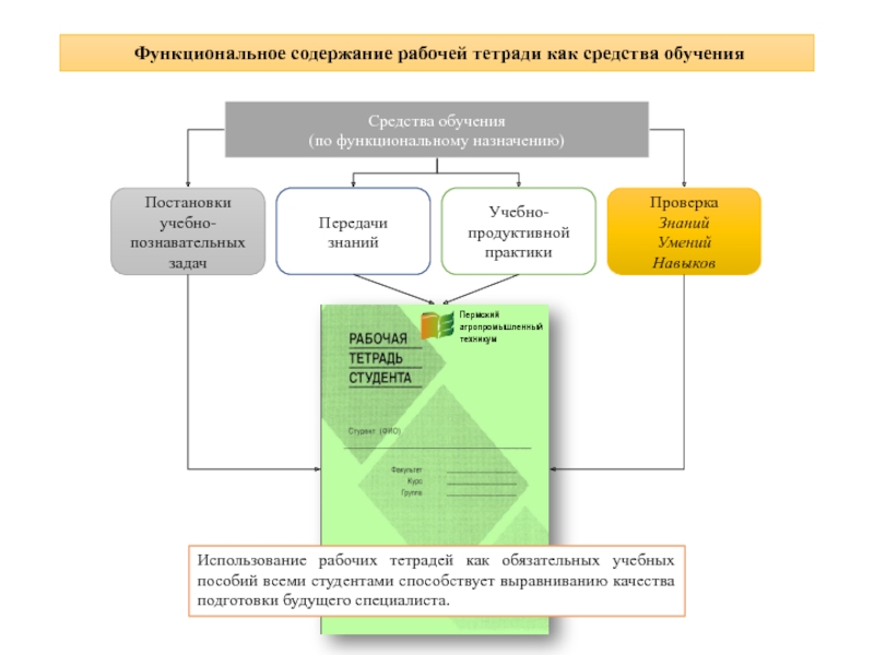Использование рабочих тетрадей как обязательных учебных пособий всеми студентами способствует выравниванию качества подготовки будущего специалиста.