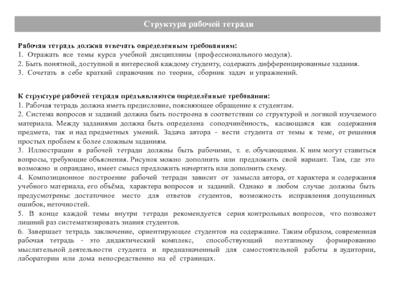 К структуре рабочей тетради предъявляются определённые требования: