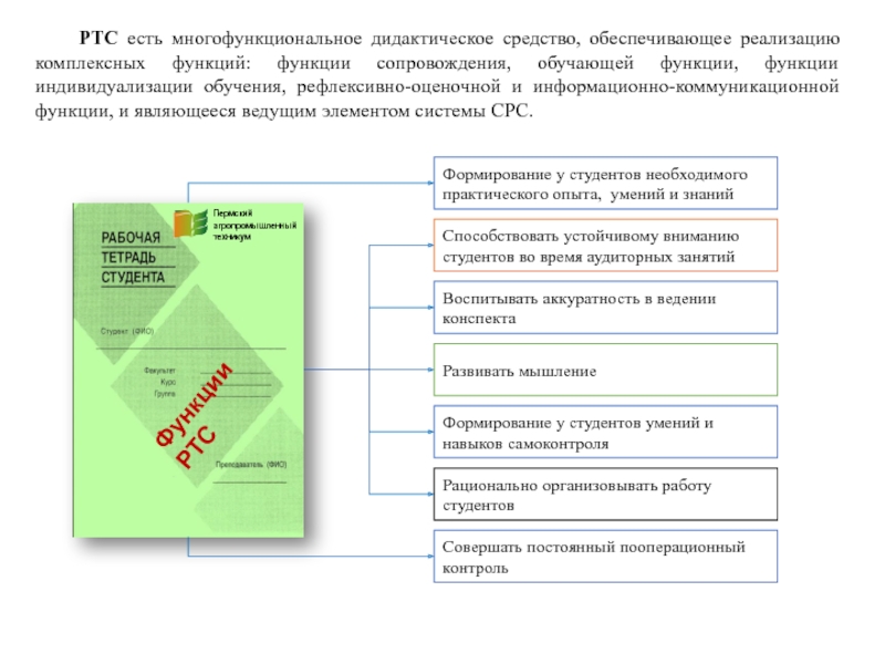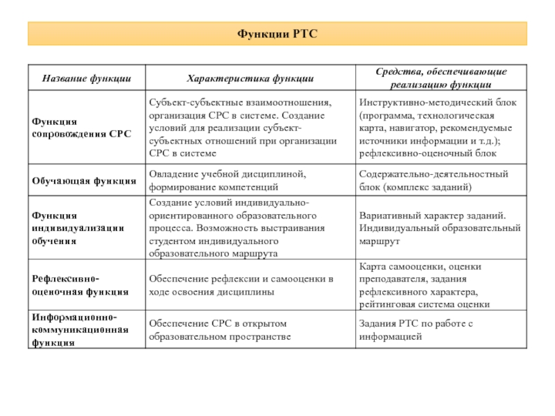 РТС есть многофункциональное дидактическое средство, обеспечивающее реализацию комплексных функций: функции сопровождения, обучающей функции, функции индивидуализации обучения, рефлексивно-оценочной и информационно-коммуникационной функции, и являющееся ведущим элементом системы СРС.