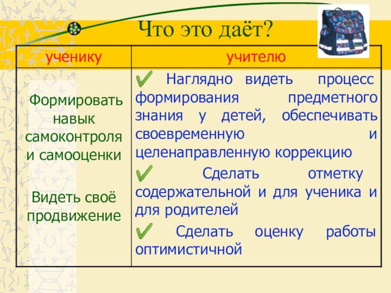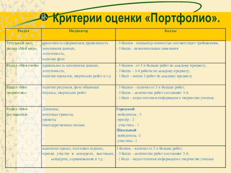 В этой папке ученик дает анализ своей деятельности и ее результатов. Эта форма Портфолио данного вида включает механизмы самооценки ученика.