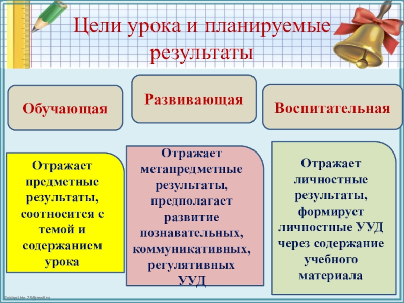 Метапредметные результаты (цели) — способы деятельности, применяемые как в образовательном процессе, так и в реальных жизненных ситуациях (регулятивные, познавательные, коммуникативные УУД)