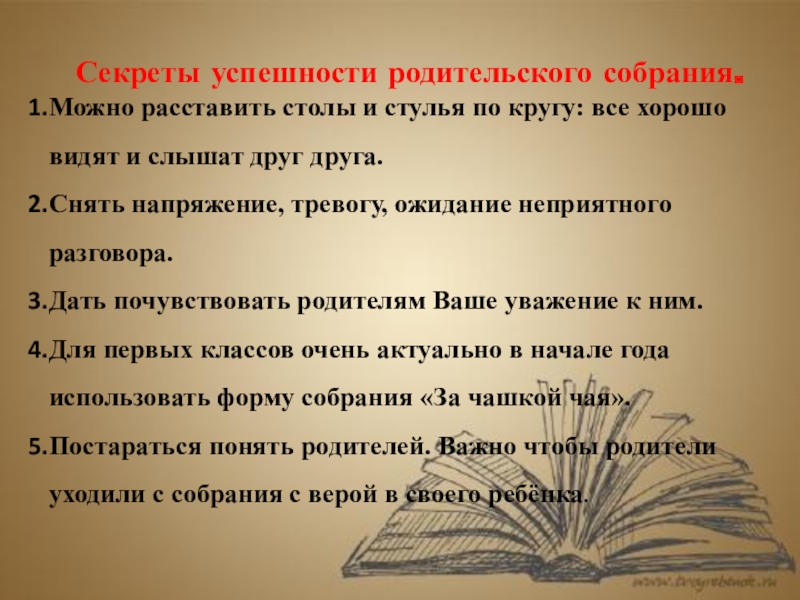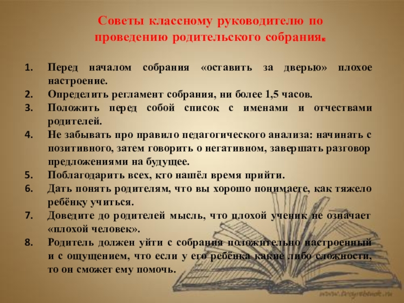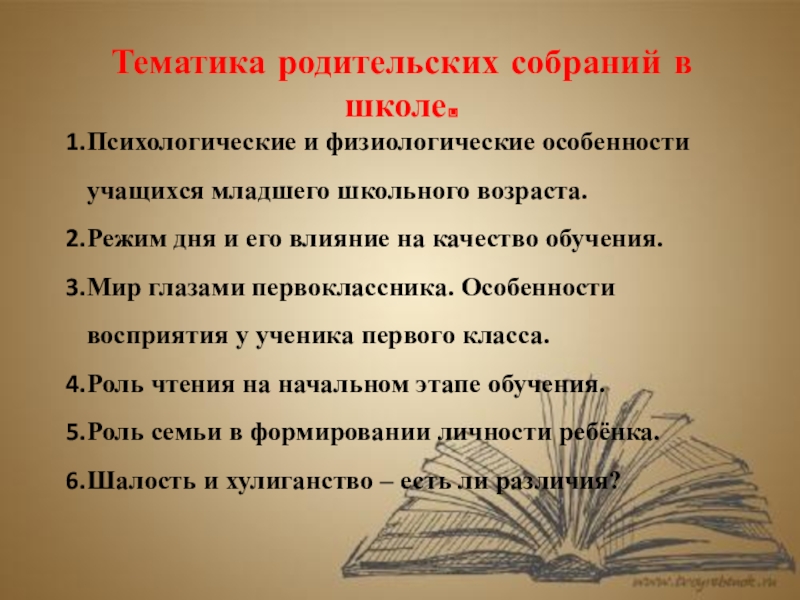 Это собрания, посвящённые актуальной теме, в обсуждении которой заинтересовано абсолютное большинство родителей класса. Тематические родительские собрания, как правило, носят просвещенческий характер и направлены на расширение знаний родителей в области воспитания детей.