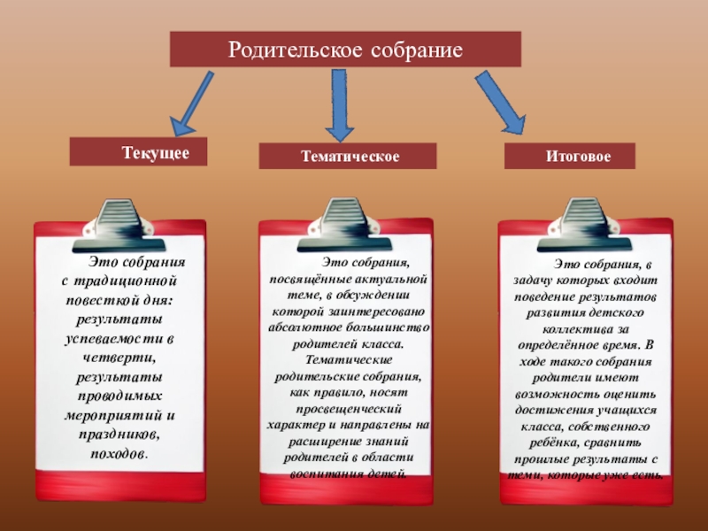 Это собрания, в задачу которых входит поведение результатов развития детского коллектива за определённое время. В ходе такого собрания родители имеют возможность оценить достижения учащихся класса, собственного ребёнка, сравнить прошлые результаты с теми, которые уже есть.