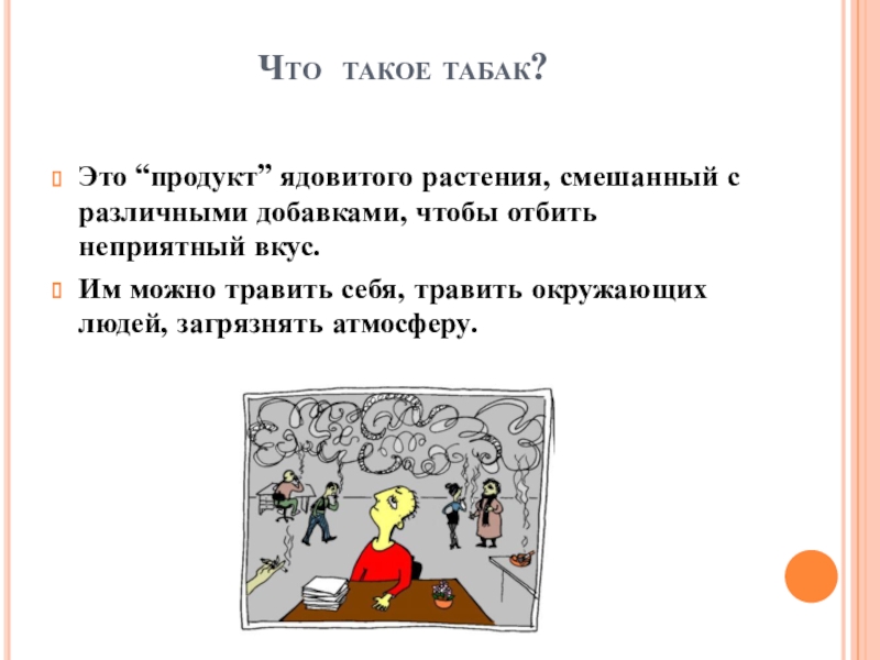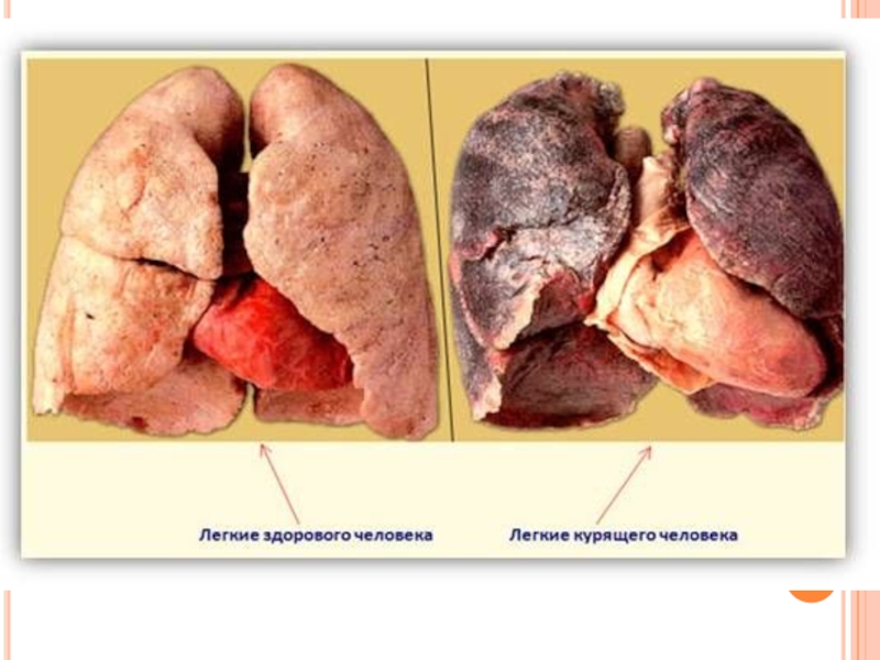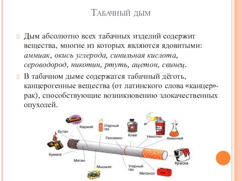 В табачном дыме содержатся табачный дёготь, канцерогенные вещества (от латинского слова «канцер»-рак), способствующие возникновению злокачественных опухолей.