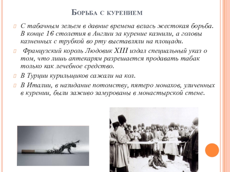 В конце 16 столетия в Англии за курение казнили, а головы казненных с трубкой во рту выставляли на площади.