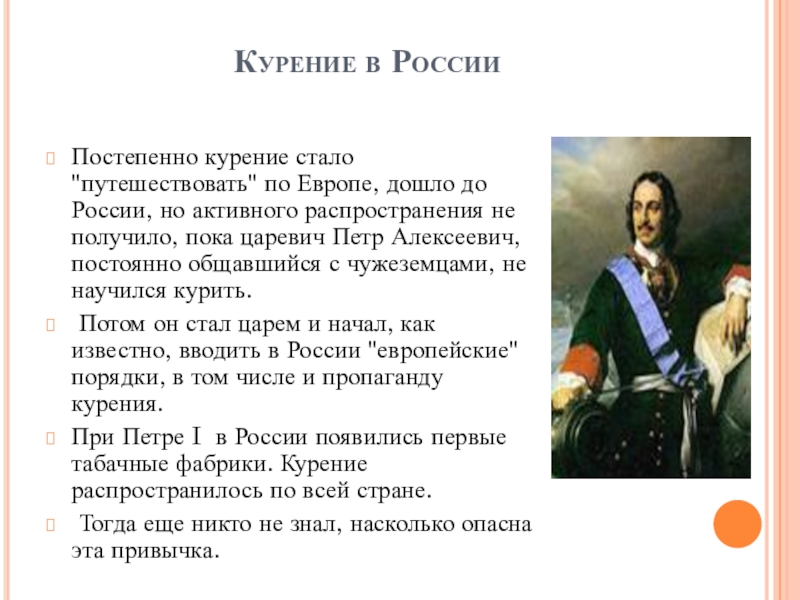Потом он стал царем и начал, как известно, вводить в России "европейские" порядки, в том числе и пропаганду курения.