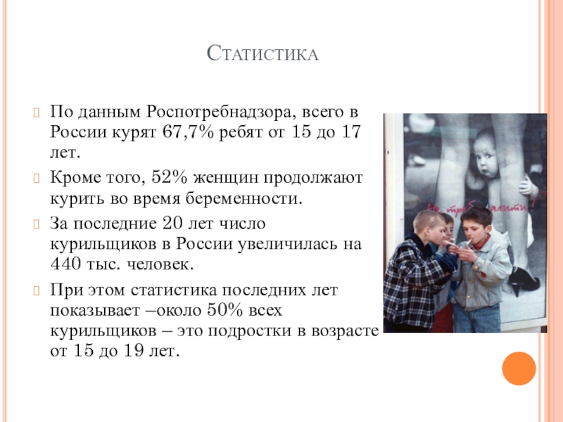 При этом статистика последних лет показывает –около 50% всех курильщиков – это подростки в возрасте от 15 до 19 лет.