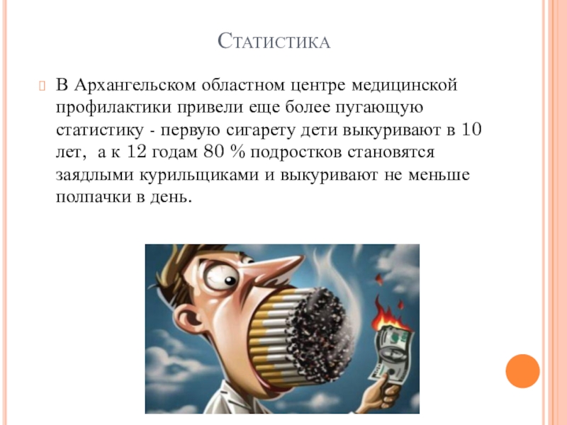 - первую сигарету дети выкуривают в 10 лет, а к 12 годам 80 % подростков становятся заядлыми курильщиками и выкуривают не меньше полпачки в день.