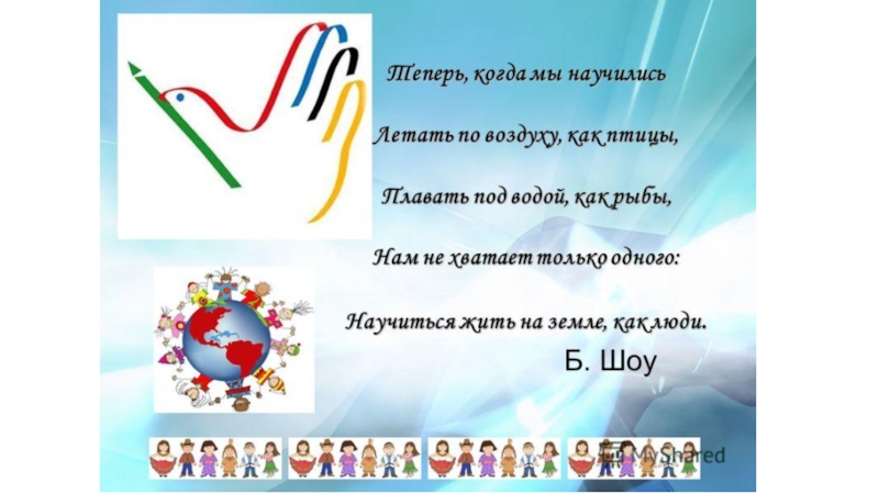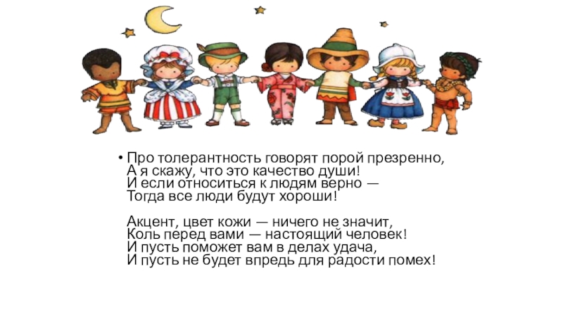 если относиться к людям верно — Тогда все люди будут хороши! Акцент, цвет кожи — ничего не значит, Коль перед вами — настоящий человек! И пусть поможет вам в делах удача, И пусть не будет впредь для радости помех!