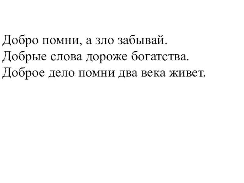 Добро помни, а зло забывай.Добрые слова дороже богатства.Доброе дело помни два века живет.