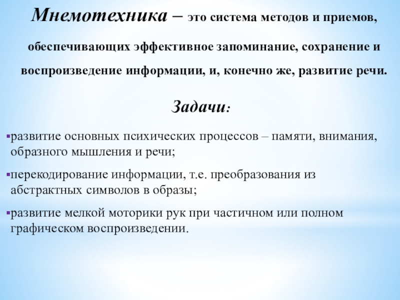 развитие основных психических процессов – памяти, внимания, образного мышления и речи;
