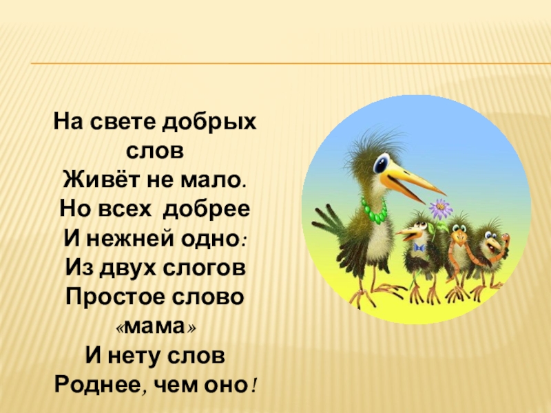 На свете добрых словЖивёт не мало.Но всех добрееИ нежней одно:Из двух слоговПростое слово «мама»И нету словРоднее, чем