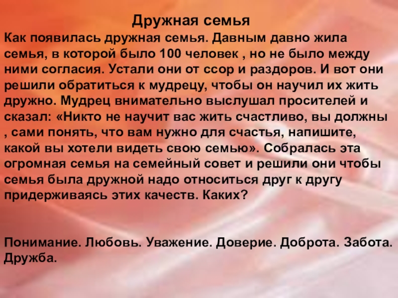Как появилась дружная семья. Давным давно жила семья, в которой было 100 человек , но не было между ними согласия. Устали они от ссор и раздоров. И вот они решили обратиться к мудрецу, чтобы он научил их жить дружно. Мудрец внимательно выслушал просителей и сказал: «Никто не научит вас жить счастливо, вы должны , сами понять, что вам нужно для счастья, напишите, какой вы хотели видеть свою семью». Собралась эта огромная семья на семейный совет и решили они чтобы семья была дружной надо относиться друг к другу придерживаясь этих качеств. Каких?