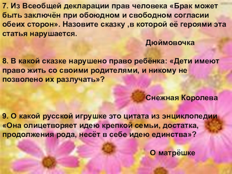 7. Из Всеобщей декларации прав человека «Брак может быть заключён при обоюдном и свободном согласии обеих сторон». Назовите сказку ,в которой её героями эта статья нарушается.