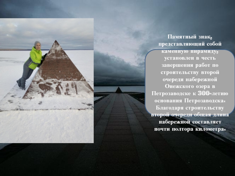 Памятный знак, представляющий собой каменную пирамиду, установлен в честь завершения работ по строительству второй очереди набережной Онежского