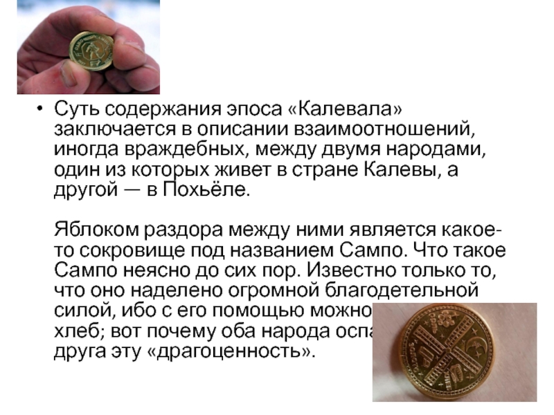 Слайд 5Суть содержания эпоса «Калевала» заключается в описании взаимоотношений, иногда враждебных, между