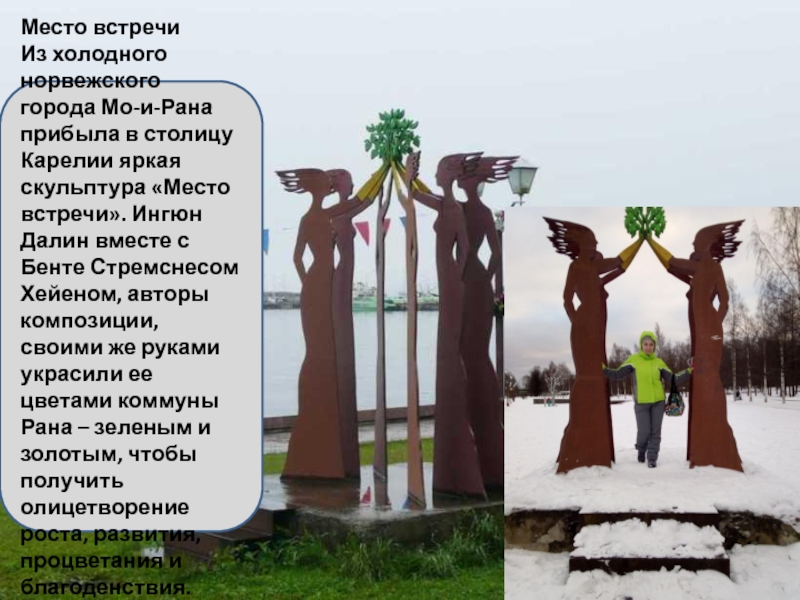 Место встречиИз холодного норвежского города Мо-и-Рана прибыла в столицу Карелии яркая скульптура «Место встречи». Ингюн Далин вместе