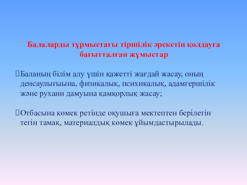 Слайд 12Балаларды тұрмыстағы тіршілік әрекетін қолдауға бағытталған жұмыстар