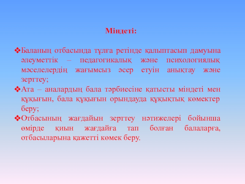 Өмірде қиын жағдайға тап болған балалардың отбасымен жұмыс істеудің, ата – ана мен бала арасындағы жағымды қарым – қатынасты орнатудың тиімді әдіс – тәсілдерін, жаңа жолдарын іздестіру;