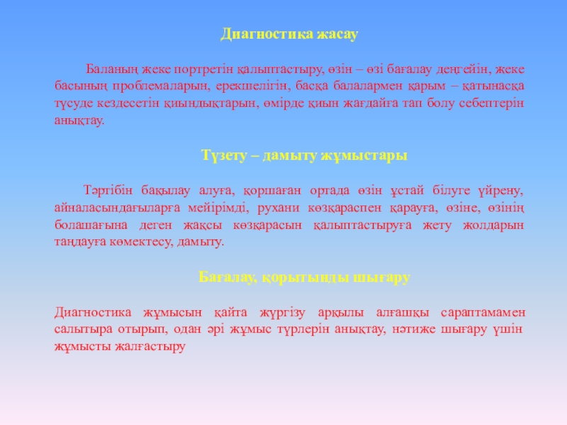 – өзі бағалау деңгейін, жеке басының проблемаларын, ерекшелігін, басқа балалармен қарым – қатынасқа түсуде кездесетін қиындықтарын, өмірде қиын жағдайға тап болу себептерін анықтау.