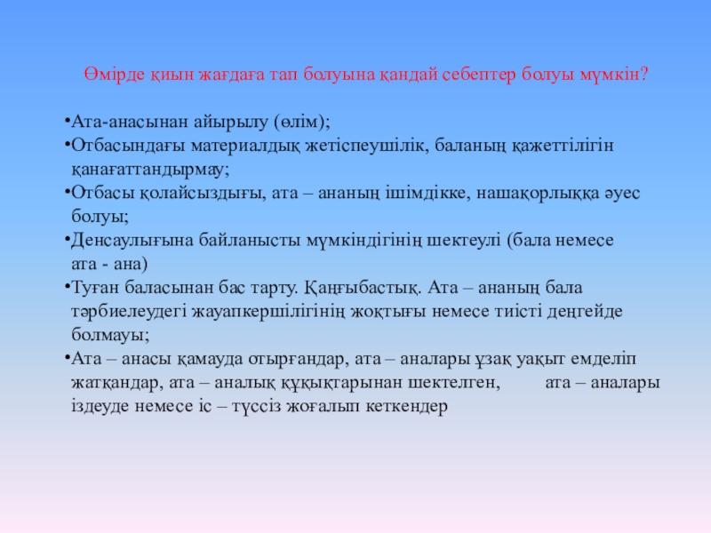 Слайд 10Өмірде қиын жағдаға тап болуына қандай себептер болуы мүмкін?